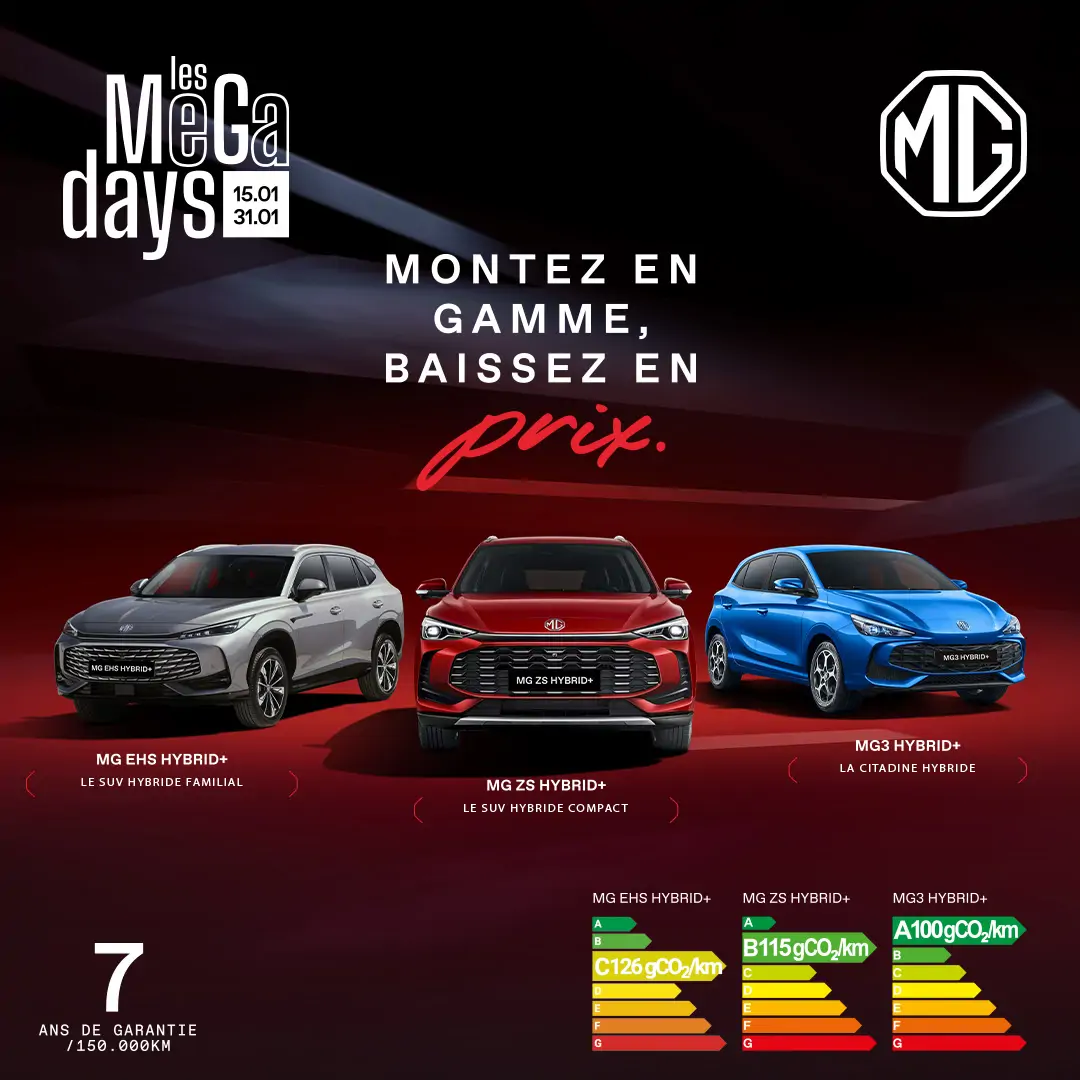 (1) Remise de 2.000 € TTC, cumulable avec 1.000 € TTC supplémentaires en cas de reprise** pour l'achat d'une MG3 Hybrid+ neuve livrable au plus tard le 27/03/2026. Offre réservée aux particuliers, du 15/01/2026 au 31/01/2026, non cumulable avec d'autres offres nationales, dans la limite des stocks disponibles et du réseau MG participant en France métropolitaine et Corse.**reprise d'un véhicule particulier de toute marque, immatriculé au nom du client depuis plus de 3 mois et remis le jour de la livraison, sous réserve d'acceptation par le concessionnaire.